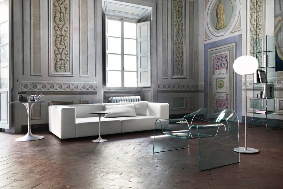 Ghost, una seduta che non si vede, cioè trasparente, che grazie alla monoliticità e all'invisibilità si distingue dalle altre fantasiose poltrone. Tutto merito del vetro, sicuro, affidabile: un solo foglio spesso 12 mm che, piegato e tagliato, forma contemporaneamente la seduta, i braccioli, lo schienale.